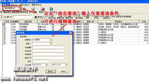 您可以對需要查找的設備項目進行模糊查找,點擊“組合查詢”輸入任意的查詢條件點擊“查詢”即可顯示查詢結果。