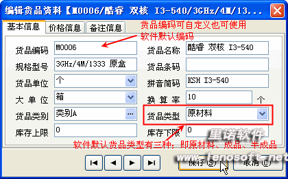 在貨品信息這一部分輸入新增貨品的所有信息,點擊“保存”按鈕即可把該貨品保存貨品列表中,保存后可以繼續輸入下一種貨品。在“貨品列表”選中某貨品后可以刪除或編輯;如果貨品增加完后可以直接點“取消”按鈕。退出增加貨品窗口后會在貨品列表中看剛才增加的貨品。如果要修改貨品,先選中要修改的貨品,點擊“編輯”按鈕打開貨品修改界面,在貨品修改界面中修改相應的信息點擊“保存”即可。點擊“刪除”按鈕即可以把選中的貨品刪除。