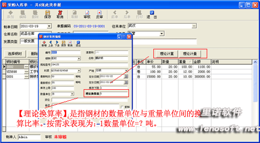 2. 多類型數據錄入模式:軟件支持入庫、出庫、退貨、調撥、盤點、等多項貨物操作流程。并配合理論計重和理論計量來配合錄單,單據操作時會根據這里設置的系數自動計算出相關的數據,此系數用戶也可手工修改。使用戶操作更快捷、方便。