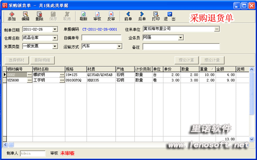 ①采購入庫:當收到鋼材資料時,可以通過入庫登記編制單據,同時庫存數量及金額增加,配合采購報表即可查閱各往來單位、各倉庫的匯總報表。