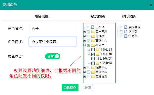 可以對(duì)角色信息進(jìn)行編輯,并可對(duì)系統(tǒng)權(quán)限及倉(cāng)庫(kù)權(quán)限進(jìn)行調(diào)整。